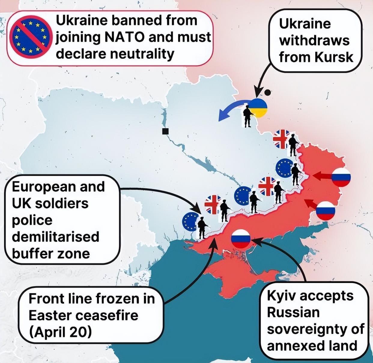 1.提议在2025年4月20日复活节之前签订休战协议,阻止俄罗斯军队的进一步推进。在现有的俄乌交战地区设立非军事区,由欧洲派遣军队负责防卫工作,美国不派兵参与。